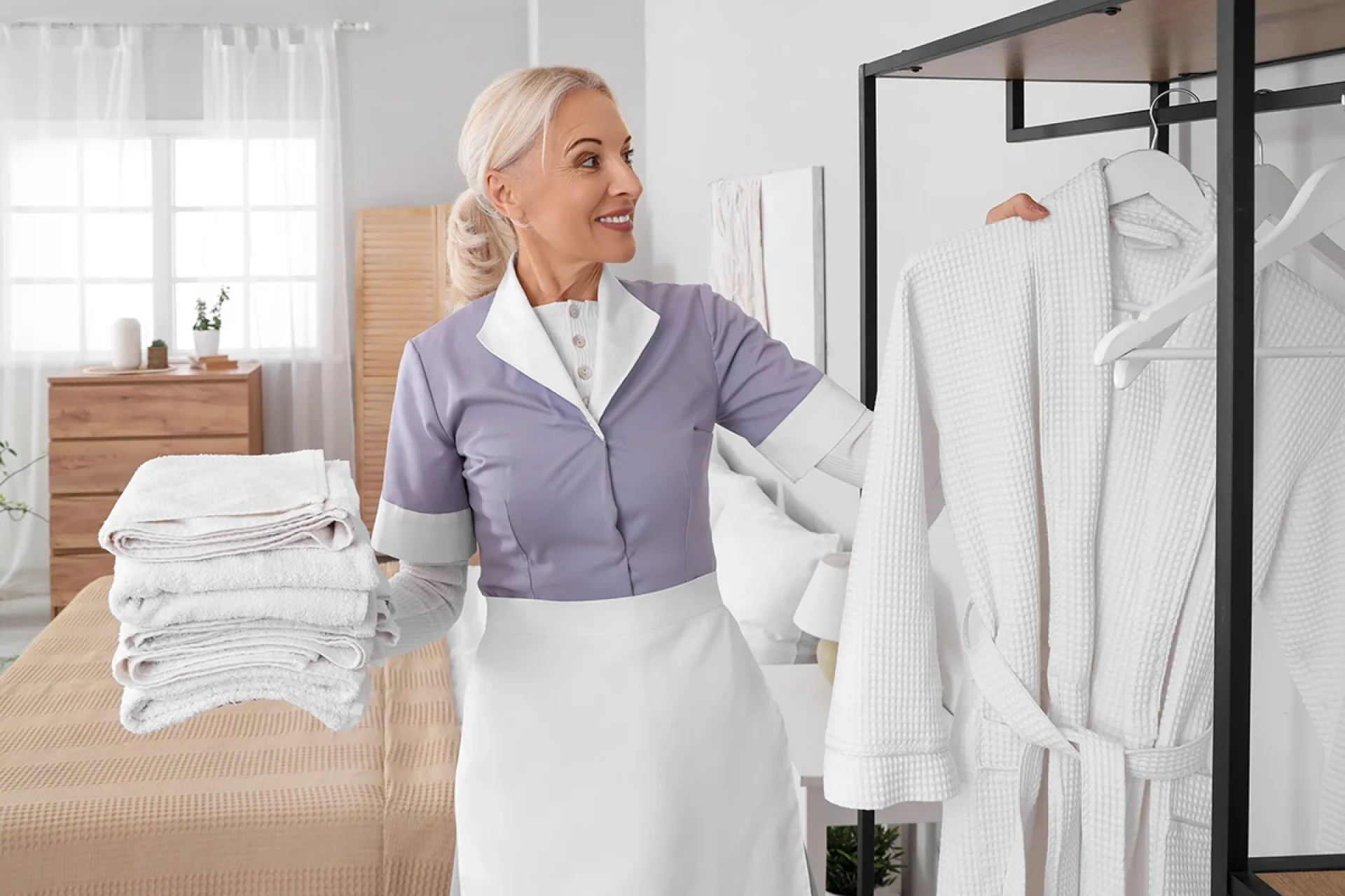 ยูนิฟอร์มแม่บ้านที่ดูเป็นระเบียบ สะอาด และสอดคล้องกับภาพลักษณ์โรงแรม จะช่วยเสริมความรู้สึกไว้วางใจและความประทับใจได้อย่างเป็นธรรมชาติ